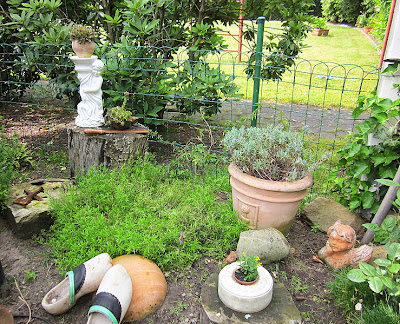 Vorne: Betonkuchen mit Blümchen. Diese Ecke des Gartens gefällt mir ganz besonders. |